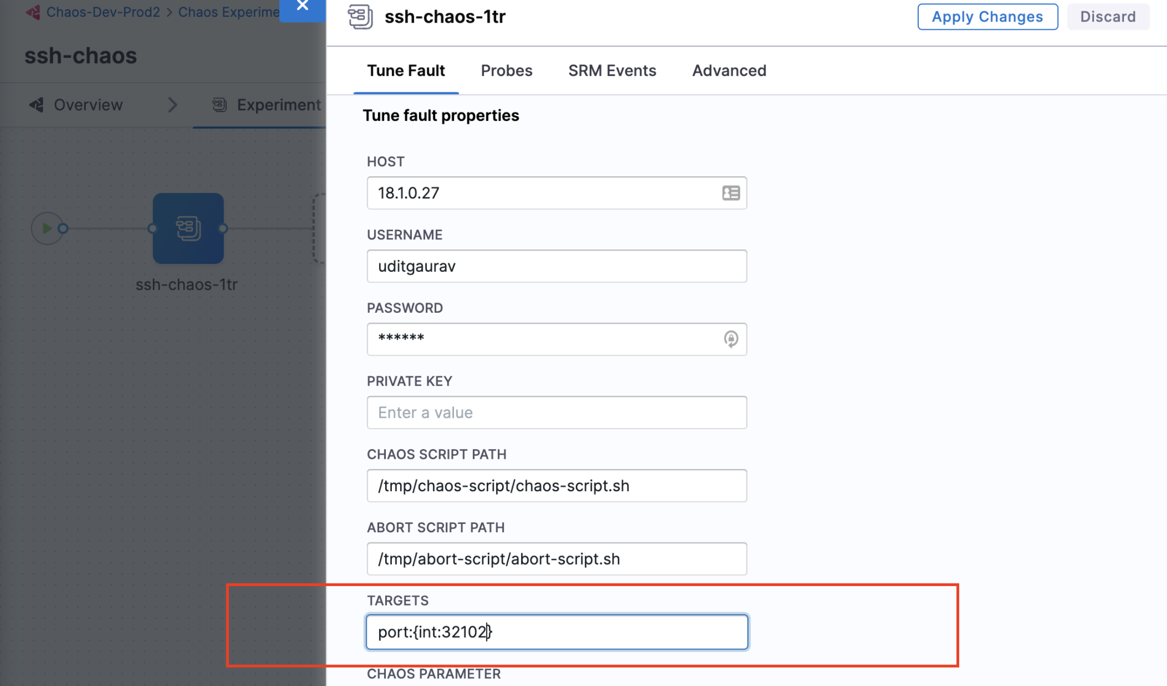 Consider the following example, that passes two parameters, an IP address and a port number to the chaos experiment.