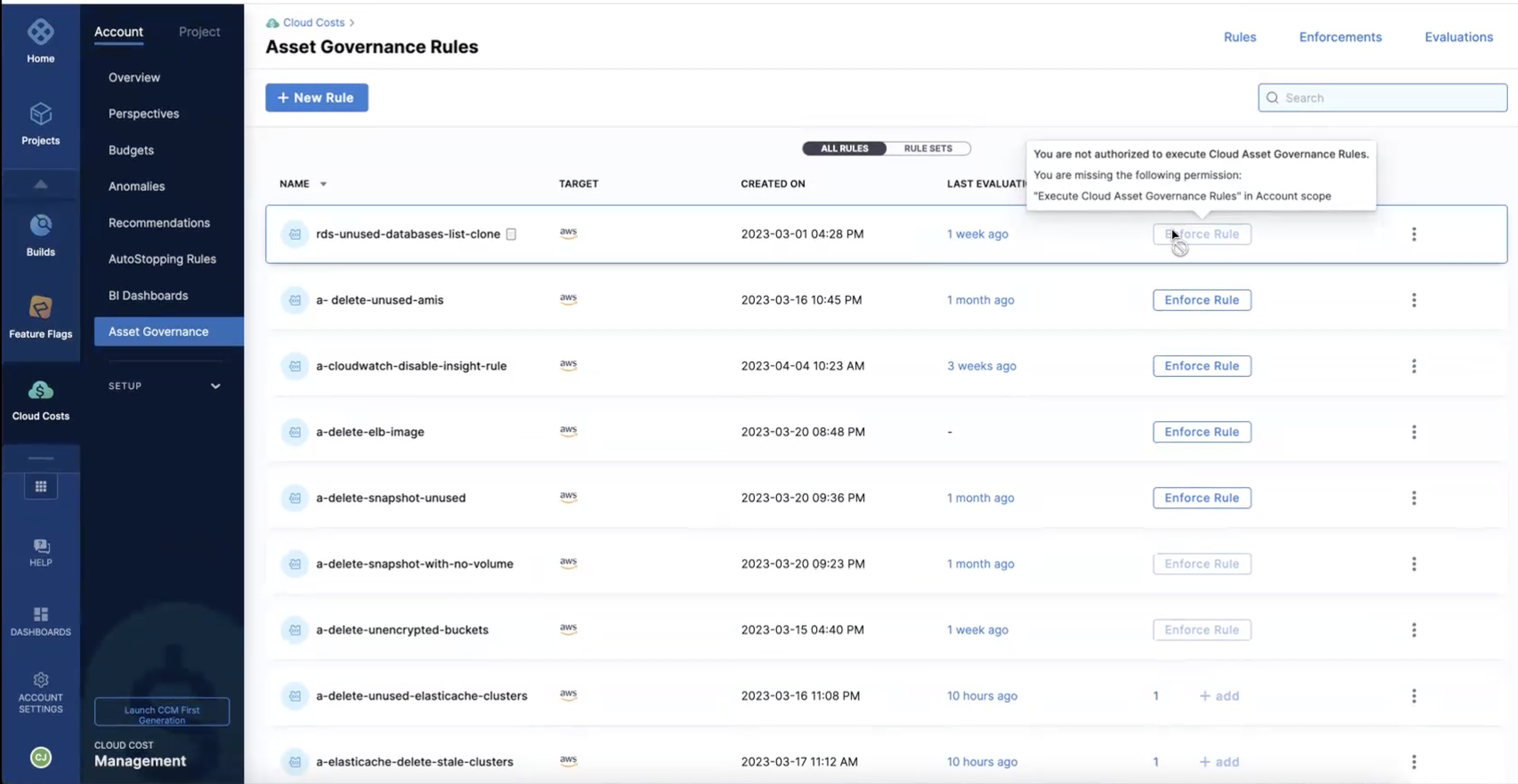 When editing an enforcement, you must have the necessary permissions for all the rules and target accounts that you want to include in the enforcement.
