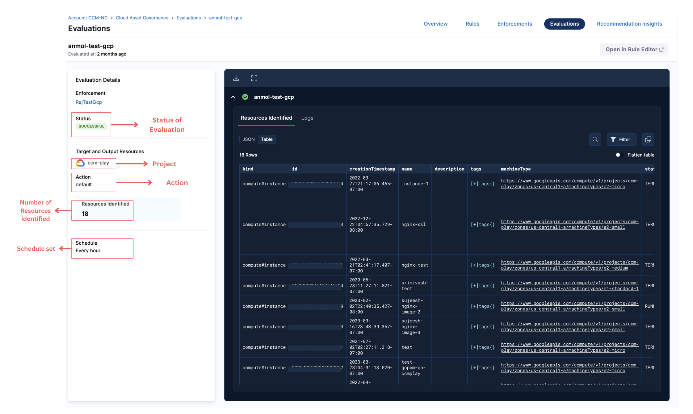 - Select the rule for which you want to view the Evaluation details. The target project, identified resources and evaluation logs are displayed.