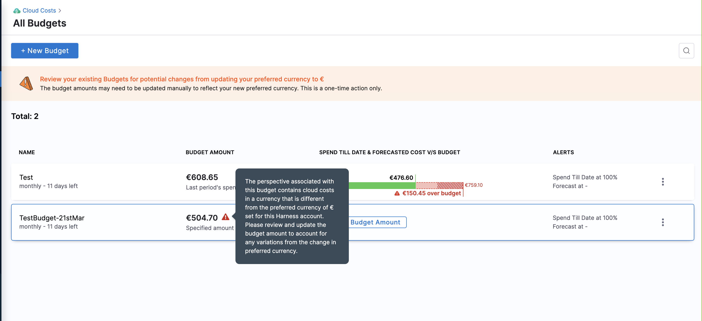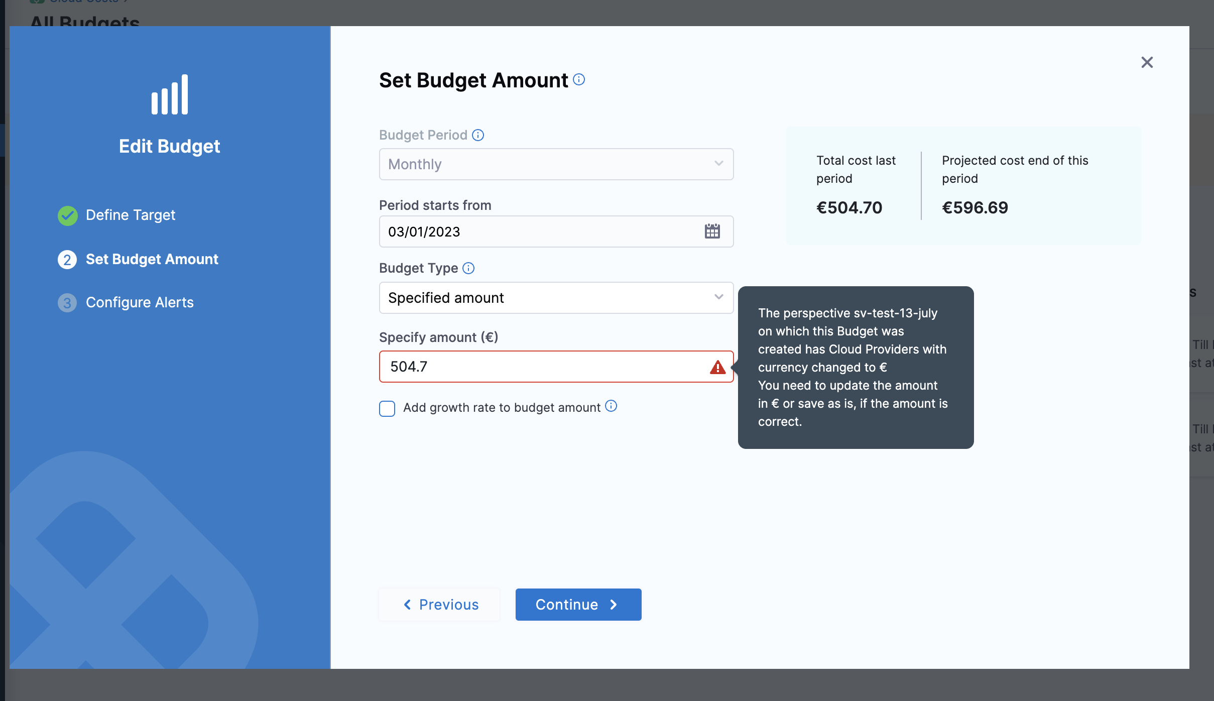 For existing budgets and new budgets, you must manually update the Specify Amount field with the converted value in the selected currency. This is because a Perspective may be associated with multiple cloud accounts and therefore cannot be updated automatically.