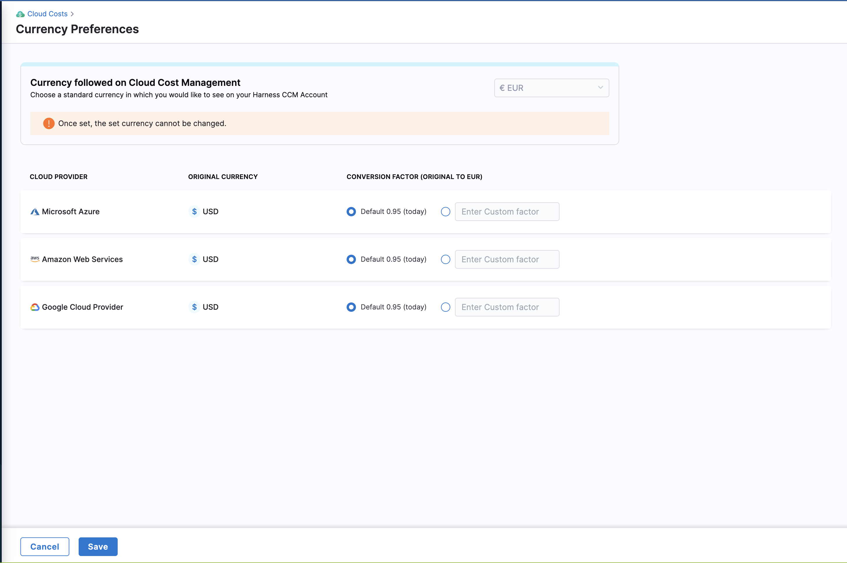 noteIf you have selected Default, the conversion factor is taken from the CUR or the Billing Export reports. If the conversion factor is not available in these reports, a publicly available conversion factor for the selected currency is used. It's important to note that the conversion factor may vary slightly between different cloud accounts.