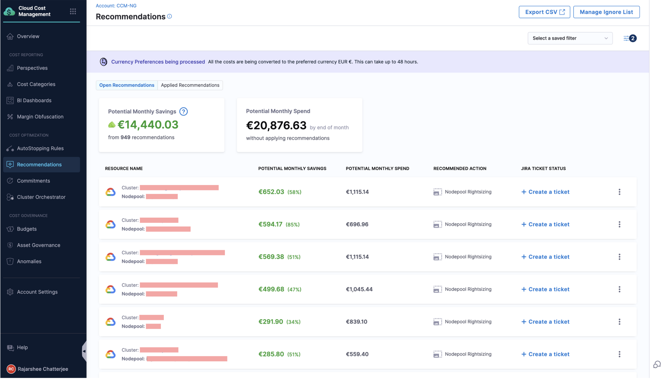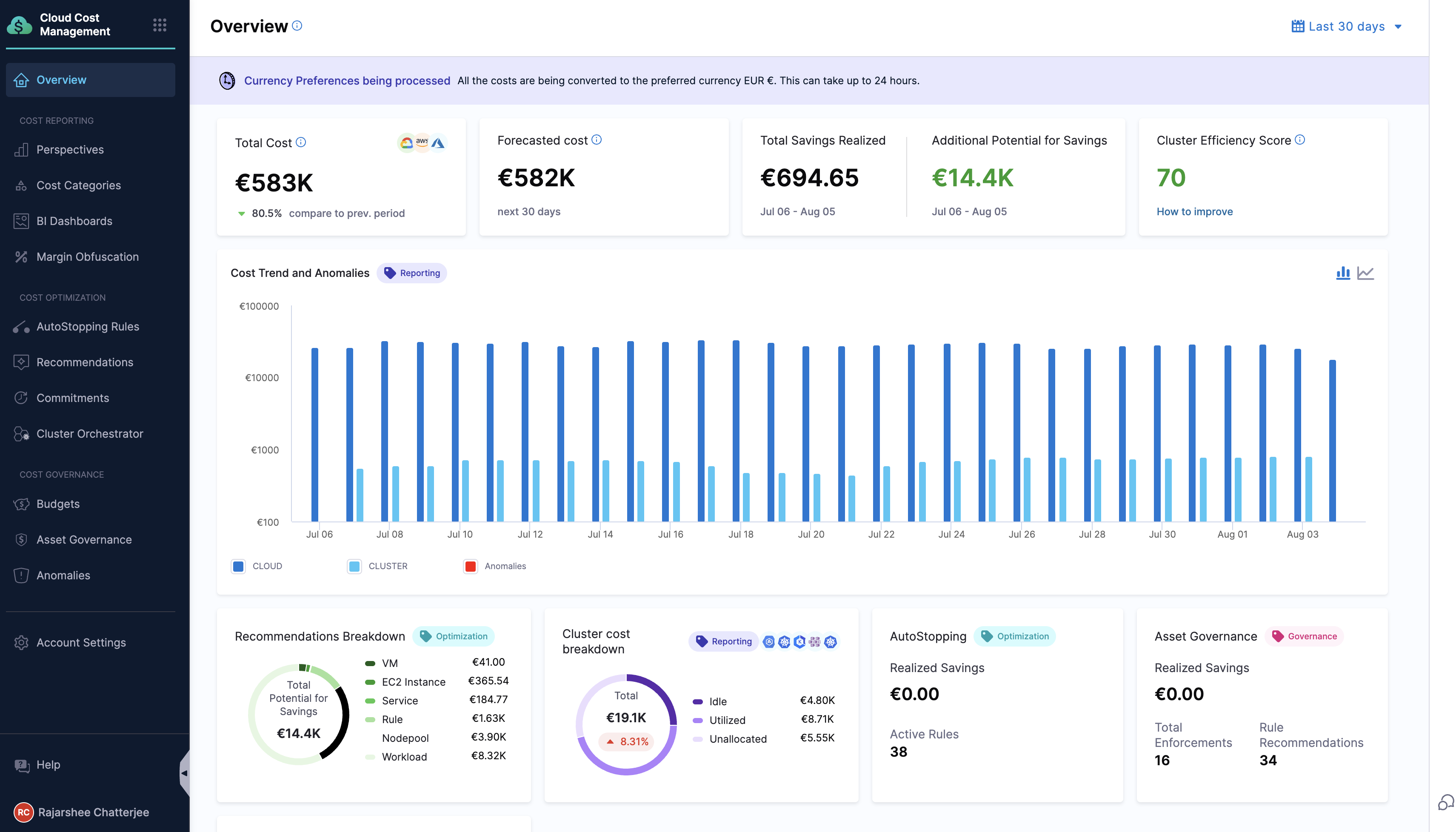 - Select the currency from the Currency followed on Cloud Cost Management dropdown list.