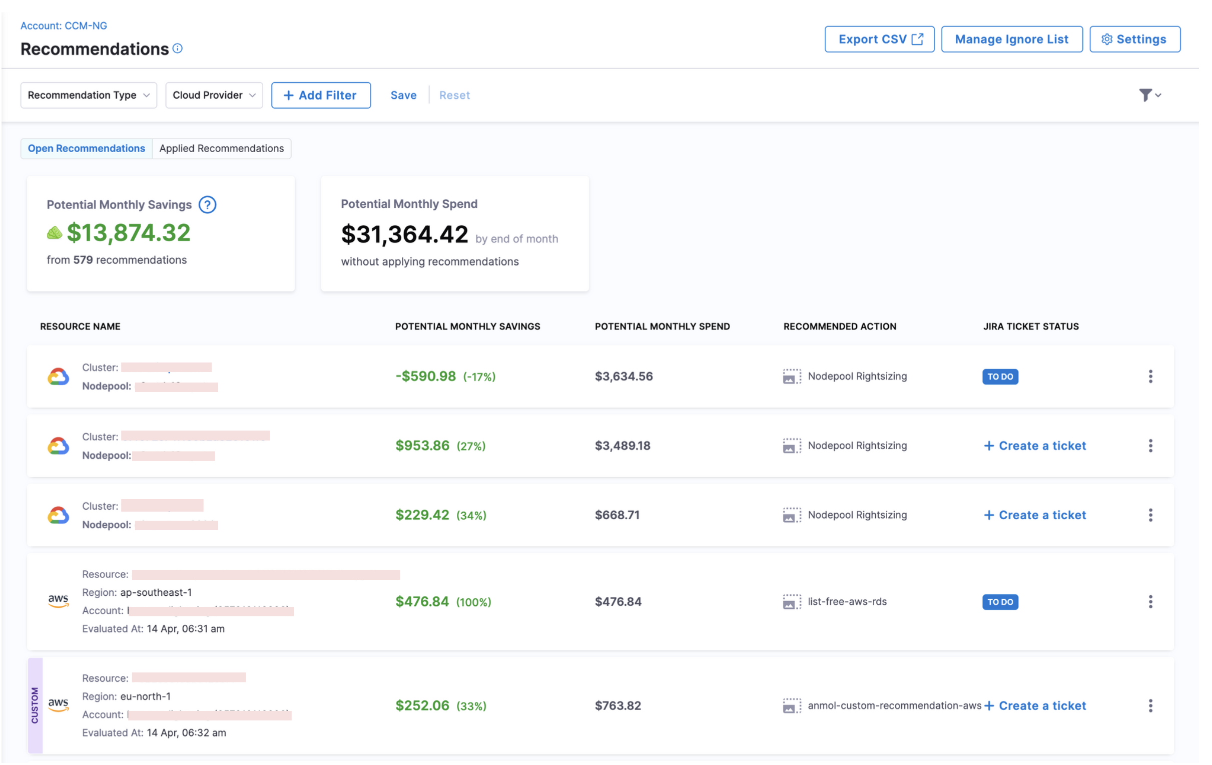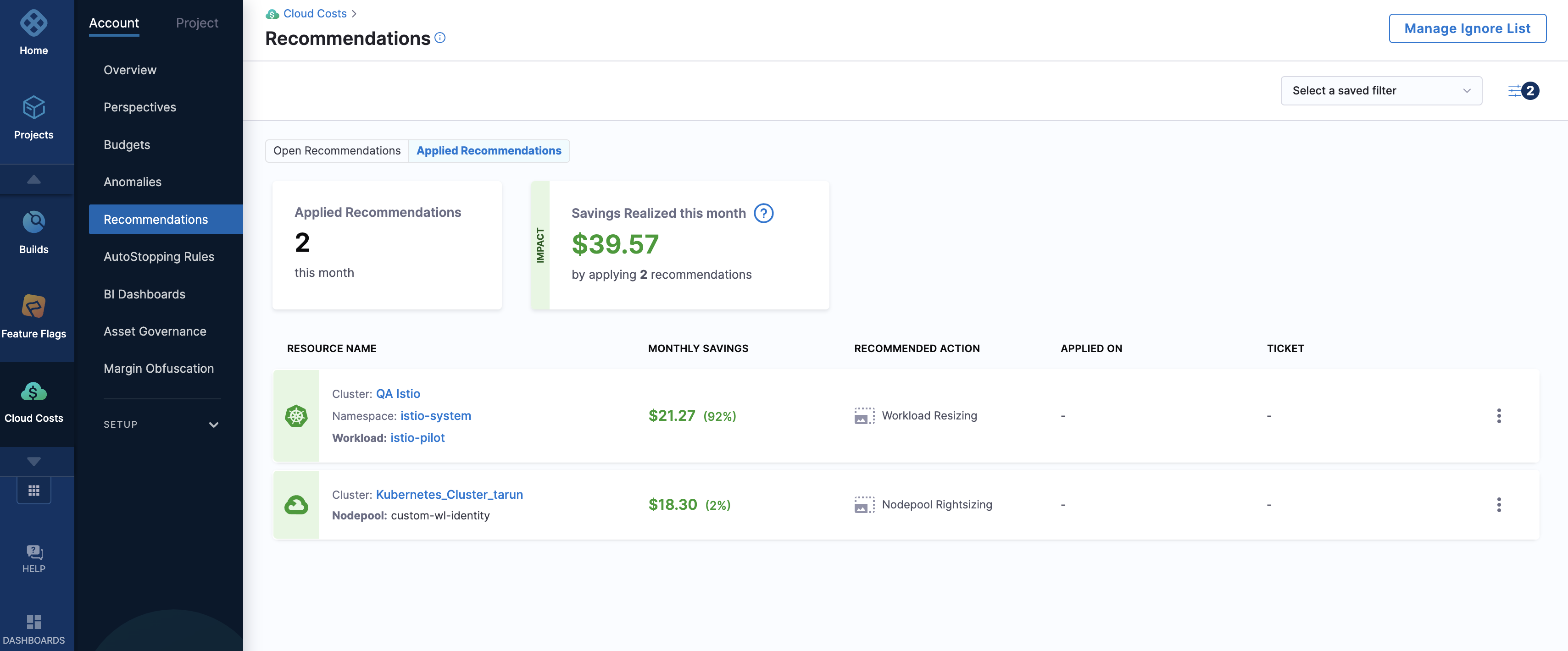 After you enable CCM, it may take up to 48 hours for the recommendations to appear in Cloud Costs. It depends on the time at which CCM receives the utilization data for the service. In Cloud Costs, go to the Recommendations page.