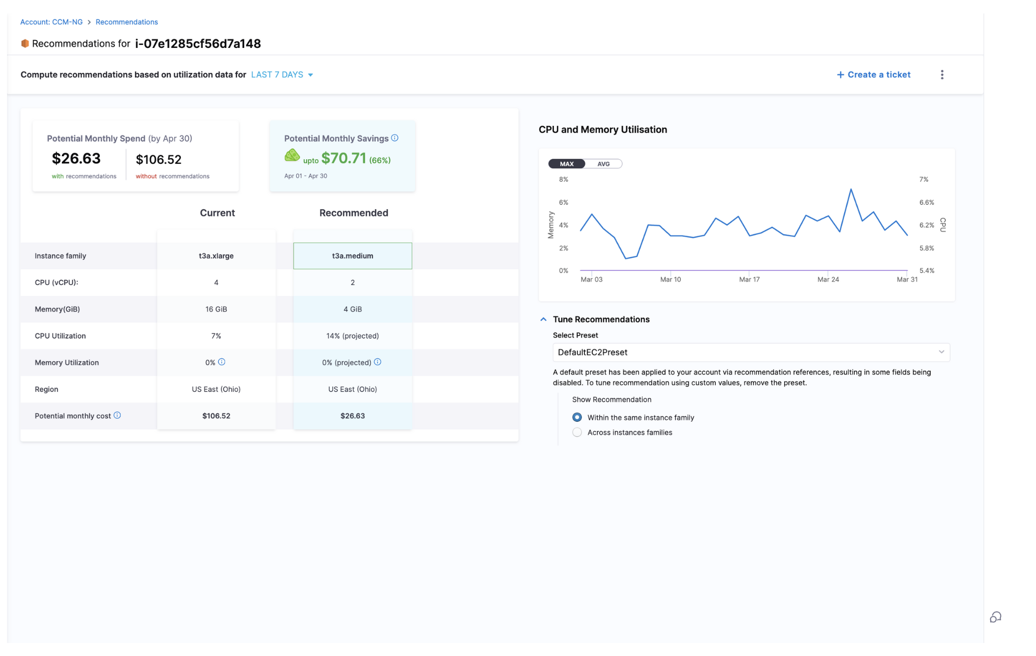 • Within the Same Instance Family: Recommendations will suggest optimized instance types within the same instance family, ensuring workload compatibility and minimizing migration complexity.