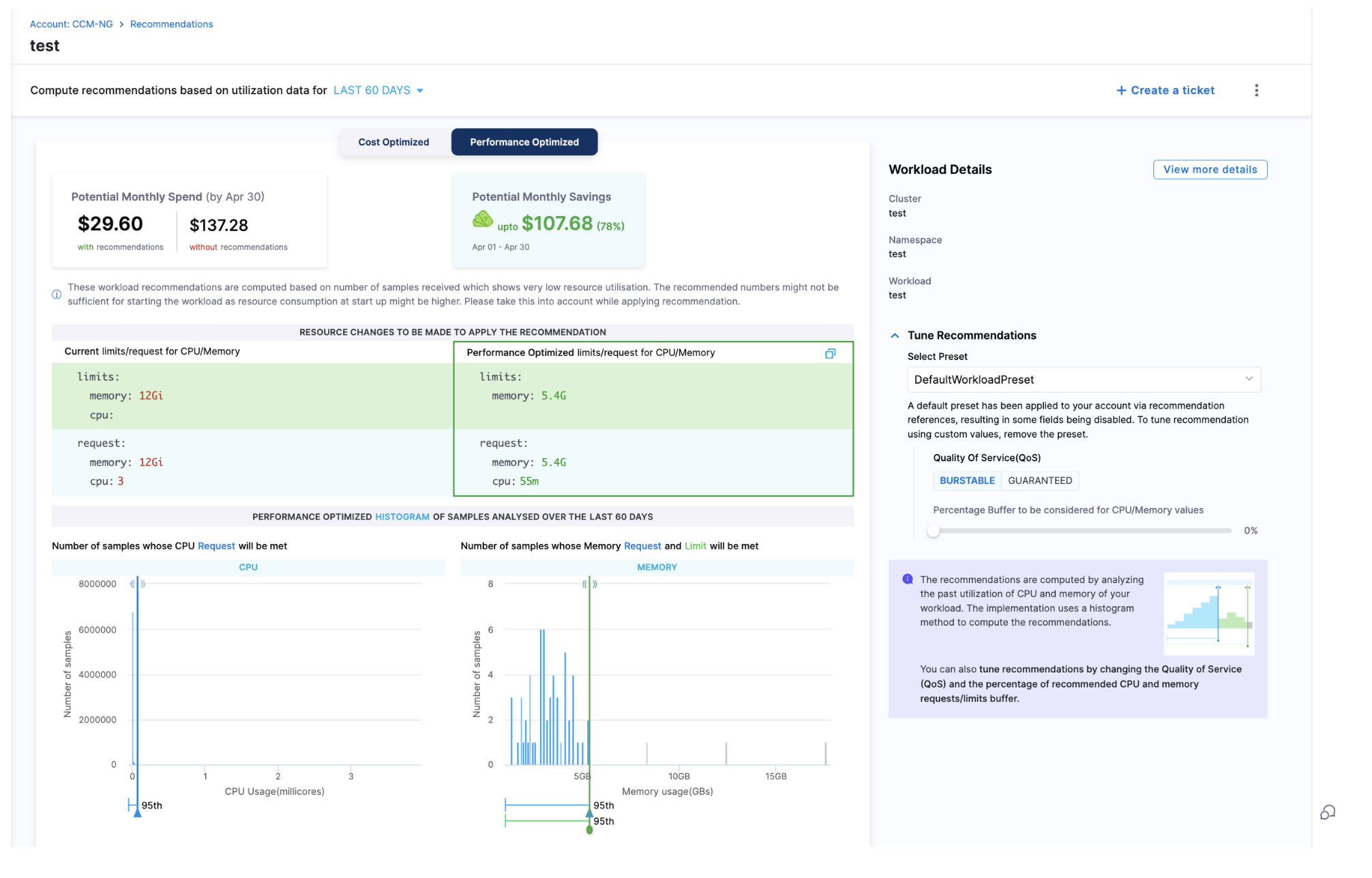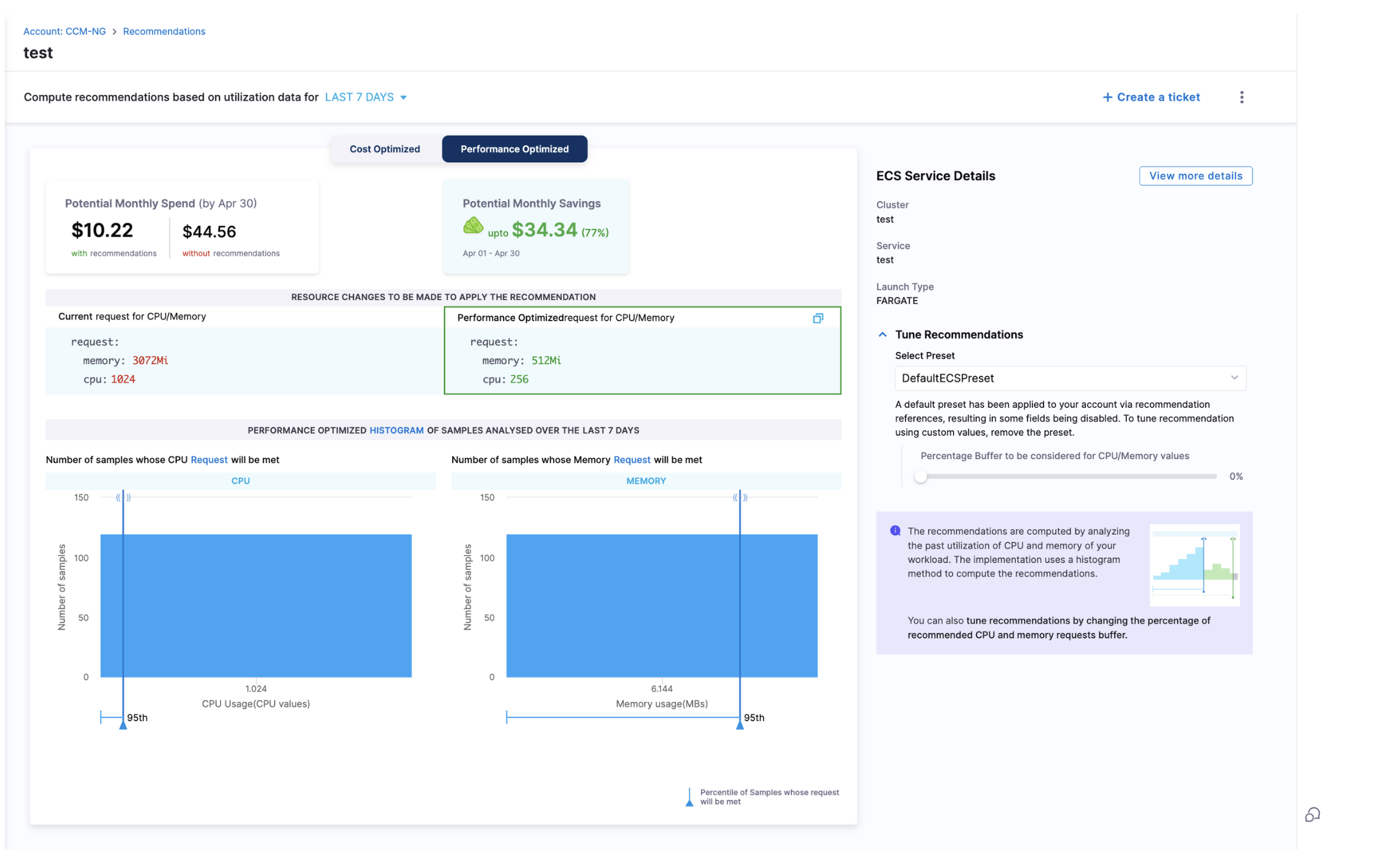 By default, Harness CCM has default presets for all resources but users can tune recommendations using custom values. To set custom values, click on the recommendation and expand the "Tune Recommendations" section to configure the tuning parameters.