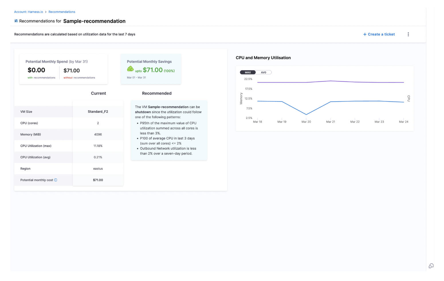 A highly effective way to reduce Azure VM costs is by optimizing VM utilization. By clicking on the Azure VM recommendation, you can view detailed information, as shown below: