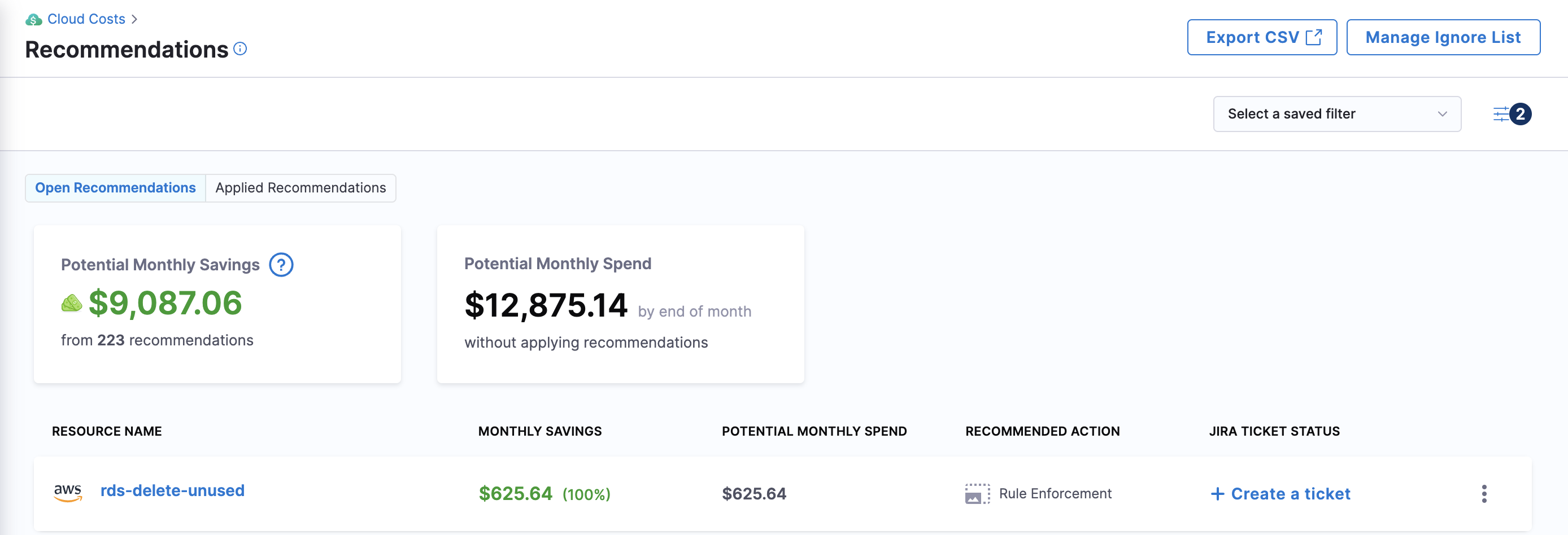 • Potential Spend — Filter by forecasted monthly spend greater than the specified amount. For example, all the recommendations with forecasted monthly spend of more than $1000.
