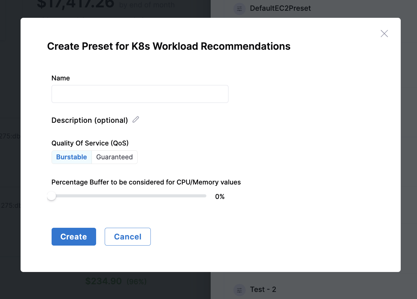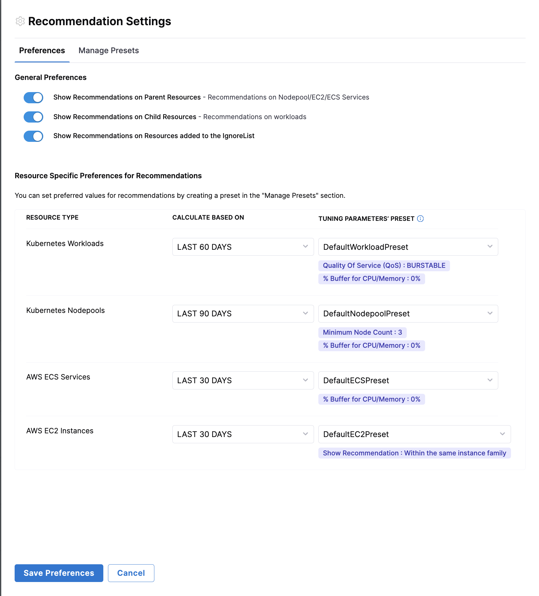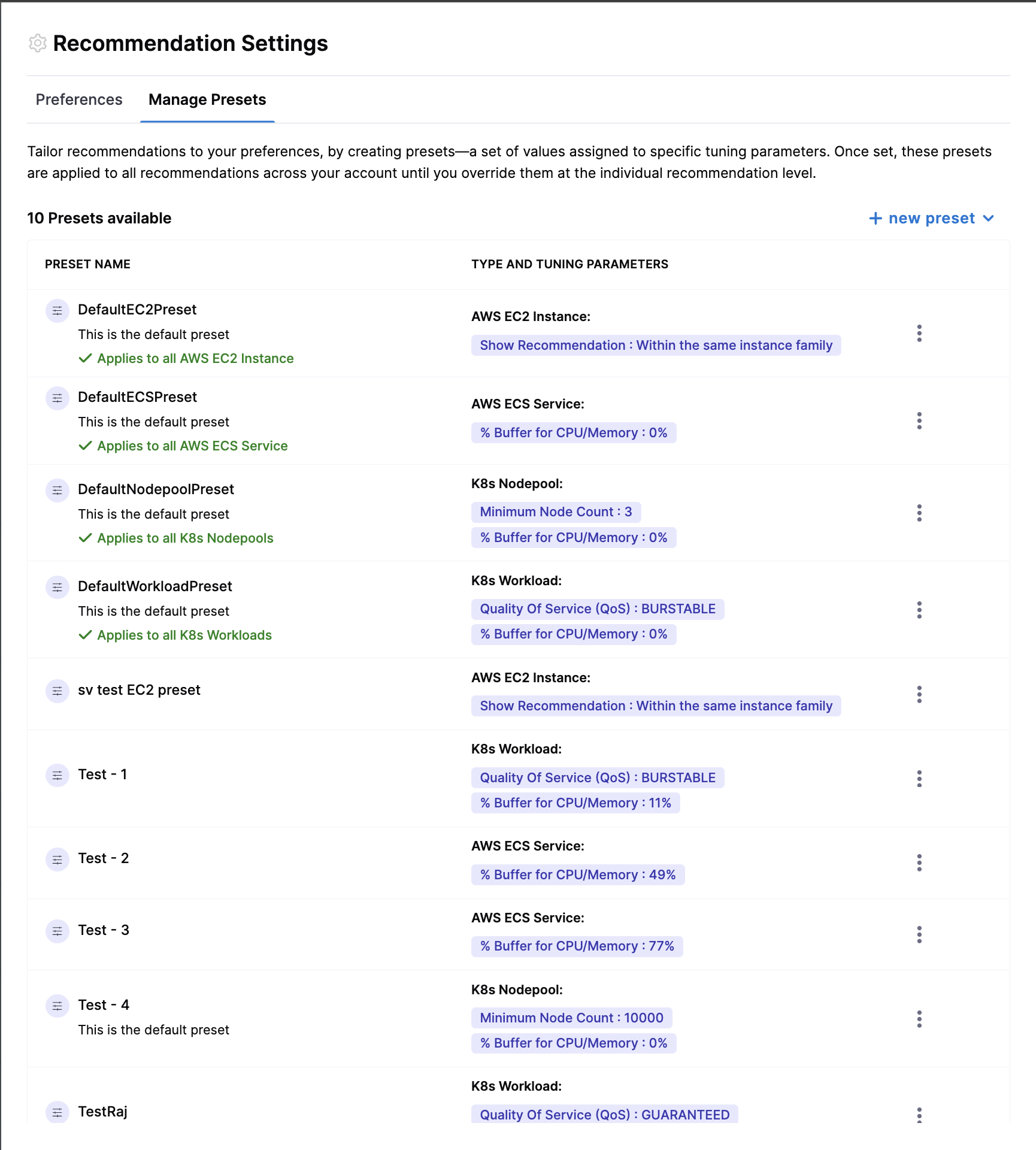 This helps users to create and save customized configurations for their recommendations. These presets capture specific user preferences, such as tuning parameters for resource types like workloads, nodepools, ECS, and EC2 instances.