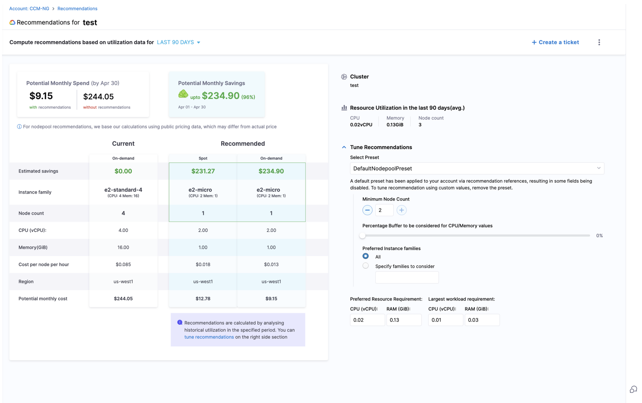 Users can fine-tune recommendations for different resource types by configuring specific tuning parameters and save presets.