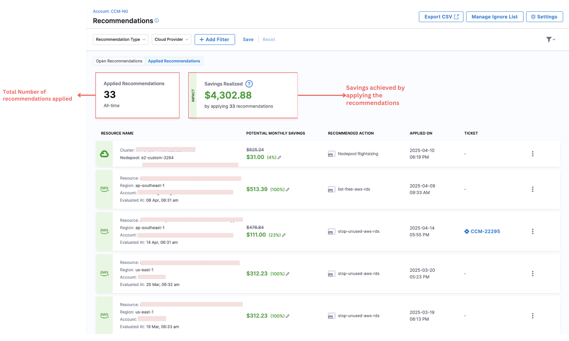 Users can now specify estimated savings when marking a recommendation as applied. Upon marking a recommendation as applied, users can now confirm whether the estimated savings matched the actual savings or enter the actual amount saved if different from the estimate. Additionally, after a recommendation has been applied, this savings data from the Applied Recommendations section can be edited.