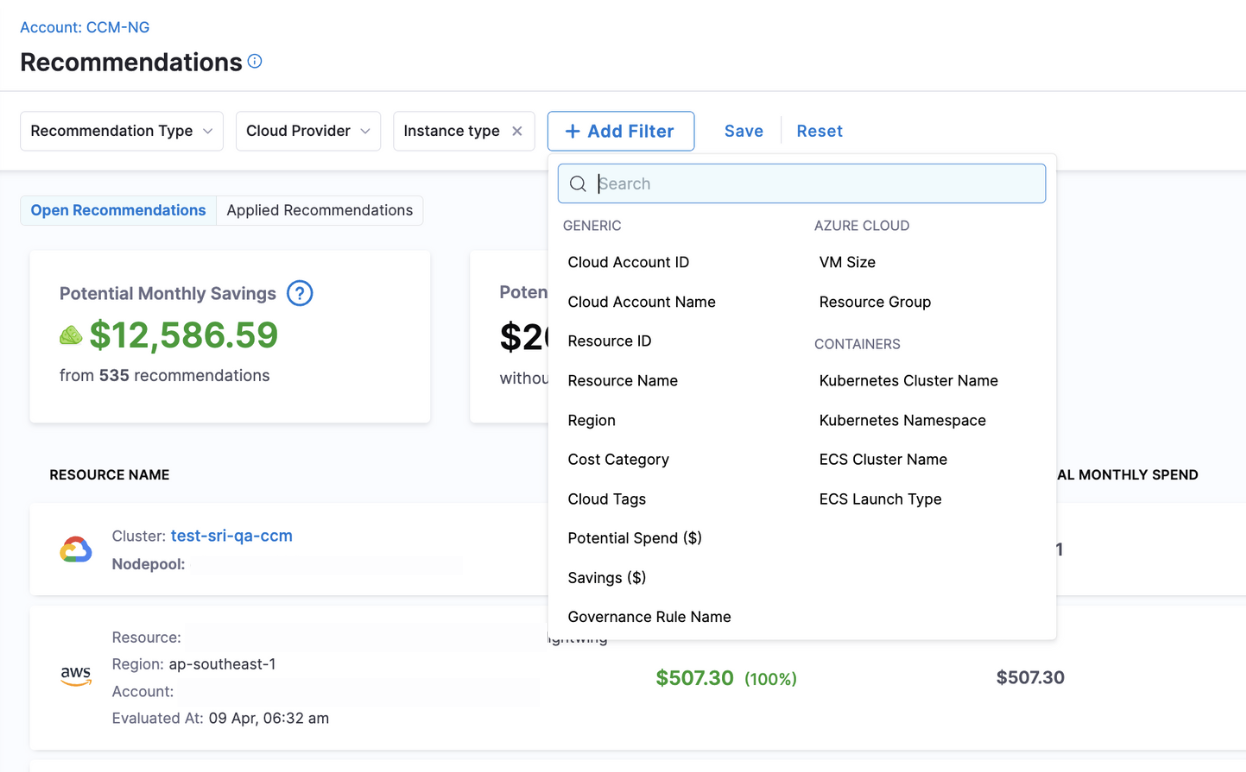Filtering support for recommendations extends to RBAC configurations based on perspective folder access settings, ensuring that cost-saving suggestions are appropriately scoped to the right teams.