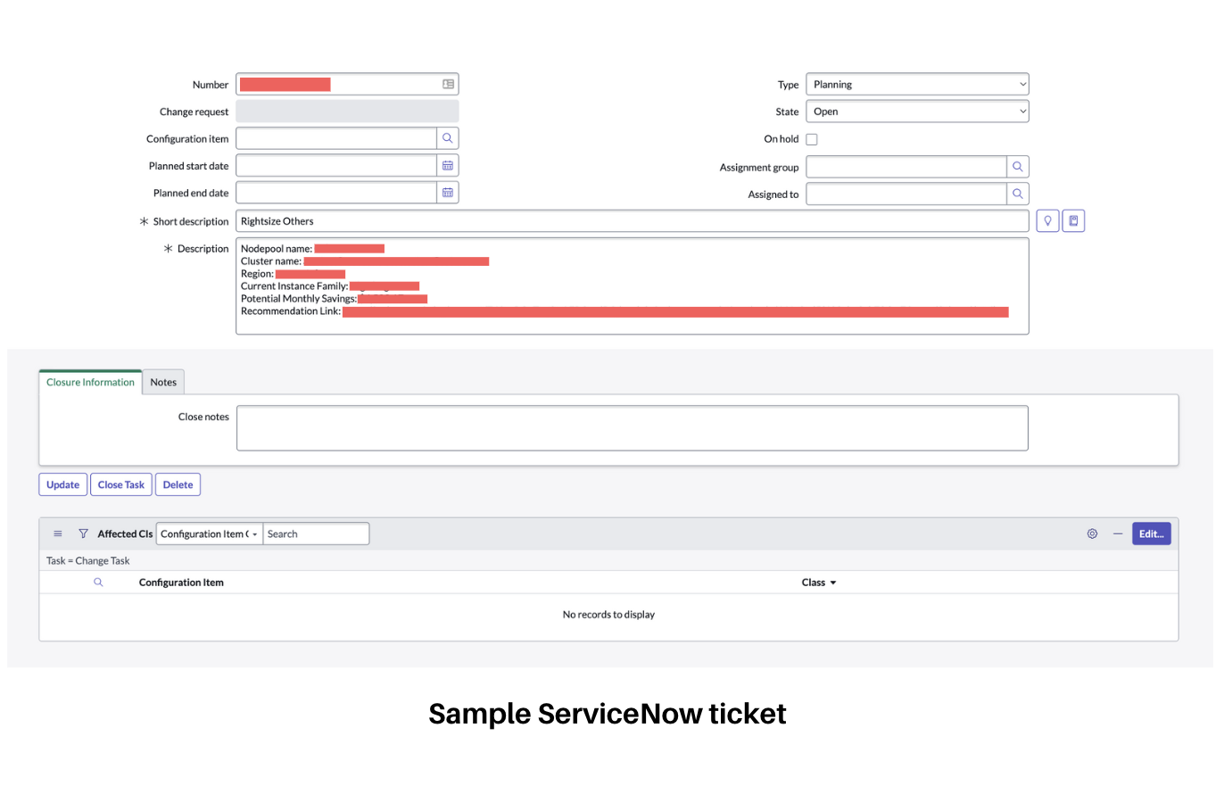 The Description field contains relevant information about the recommendation for which this ticket was created. Harness CCM retrieves the following data from ServiceNow: