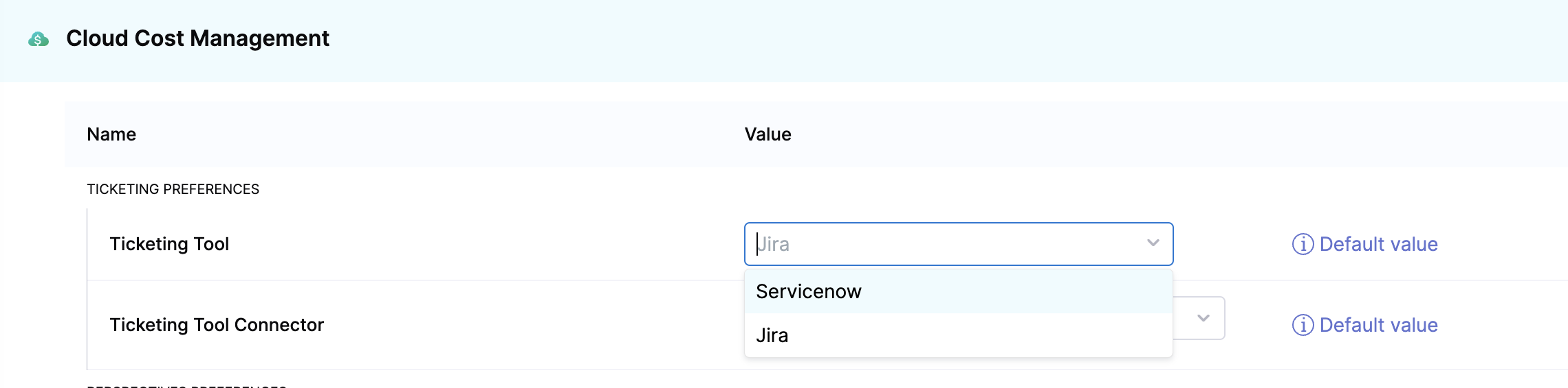 The default ticketing tool is Jira. You can choose ServiceNow if that's the tool used in your organization.