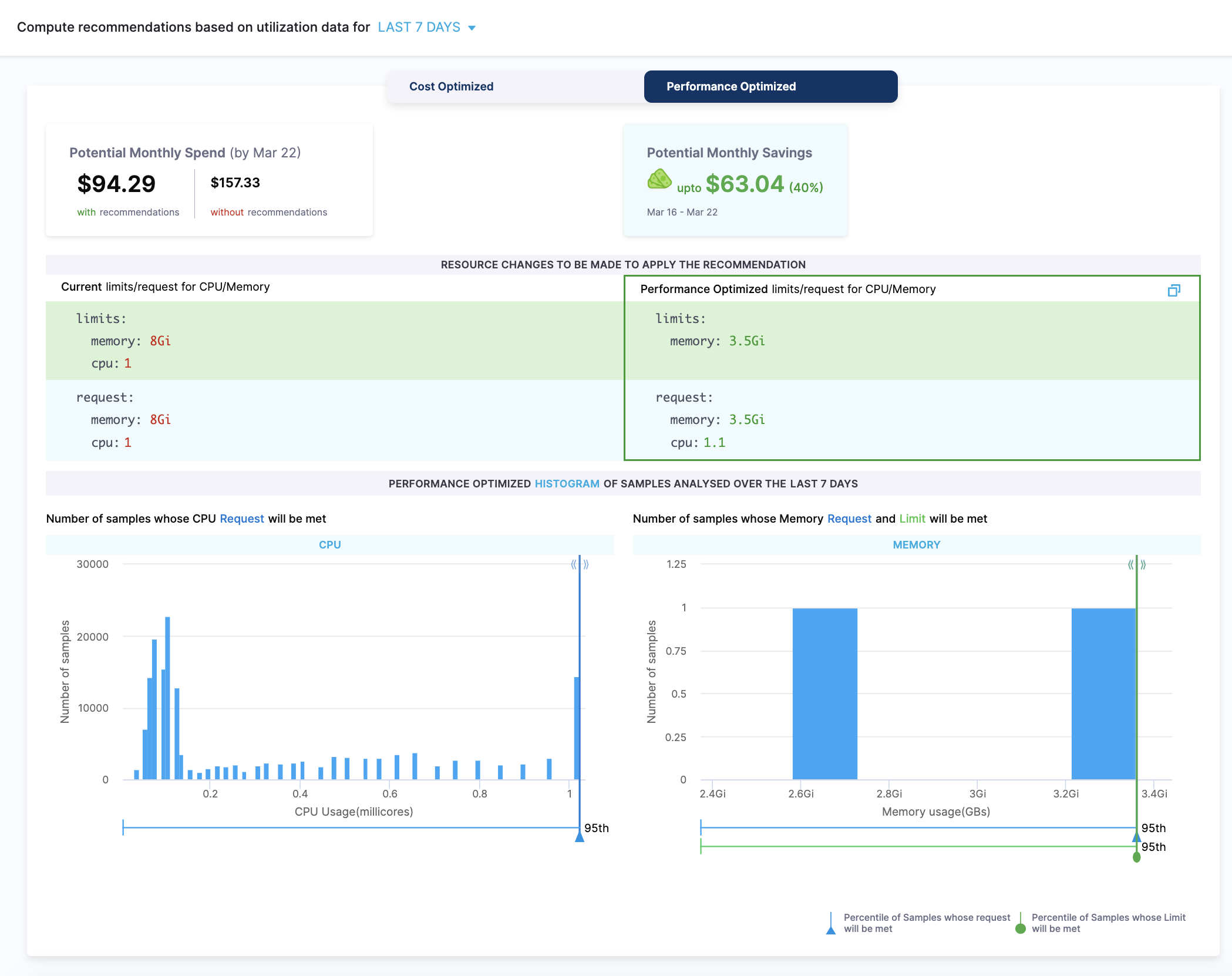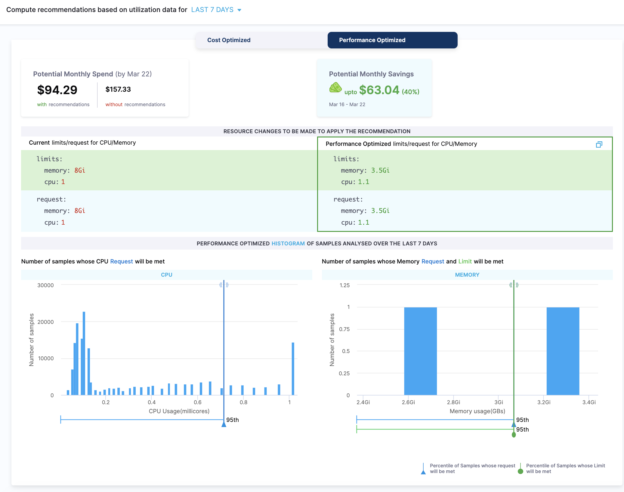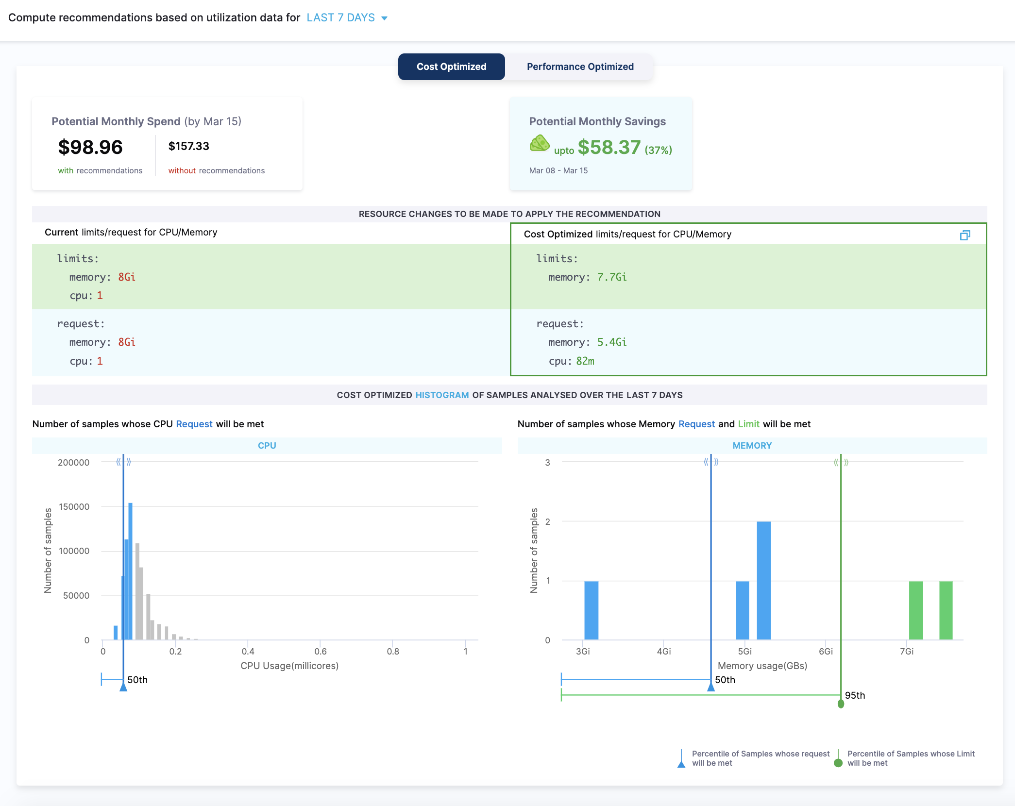 Since the recommendations are computed using the 50th percentile of the CPU samples and memory peaks, this may potentially lead to system performance issues. Before using cost-optimized recommendations, ensure that you evaluate the recommendation's impact thoroughly.