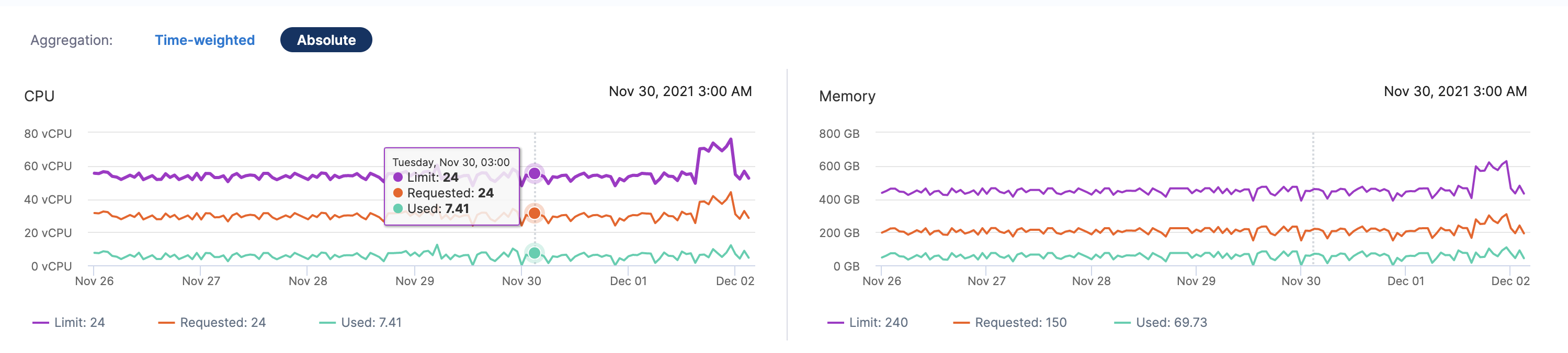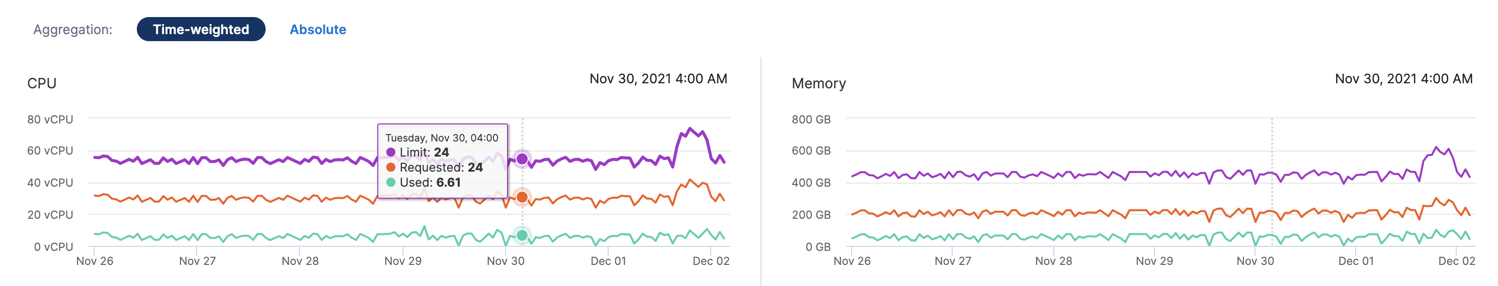 Time-weighted: This considers the active duration of pods when calculating the CPU and memory utilization.