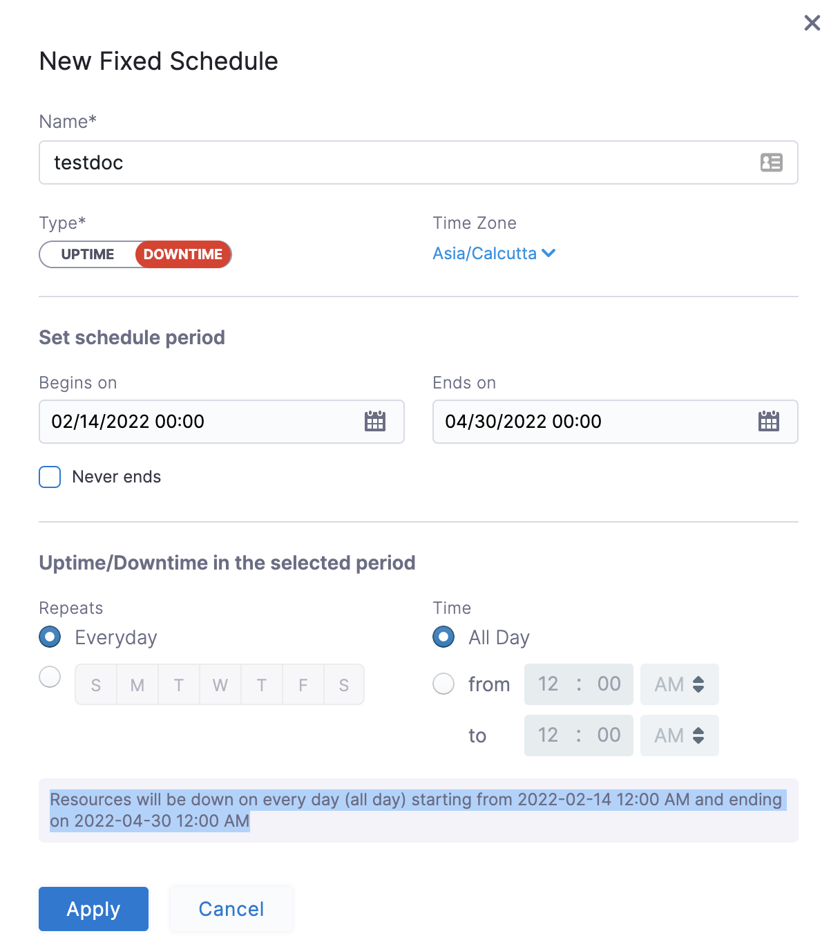 In the following example, resources are down every day (all day) starting from 12:00 a.m. on February 14, 2022 till April 30, at 12:00 a.m. -