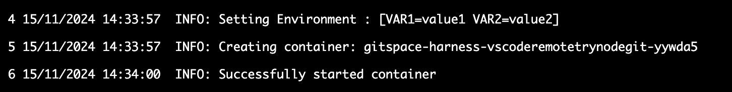 property, you can verify the environment variable setup by checking the container logs while creating a Gitspace through the Harness UI.