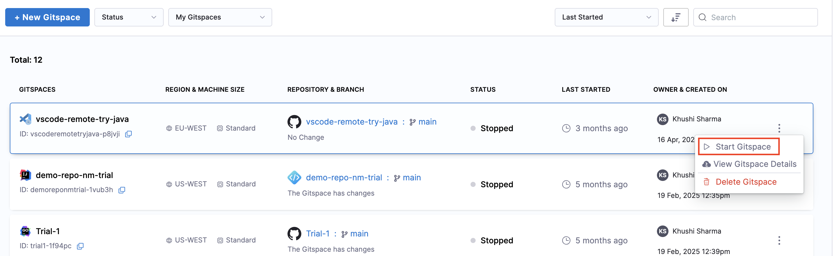 1. On the Gitspaces Dashboard, for any stopped Gitspace, click on the 3 dots menu and select Start Gitspace.