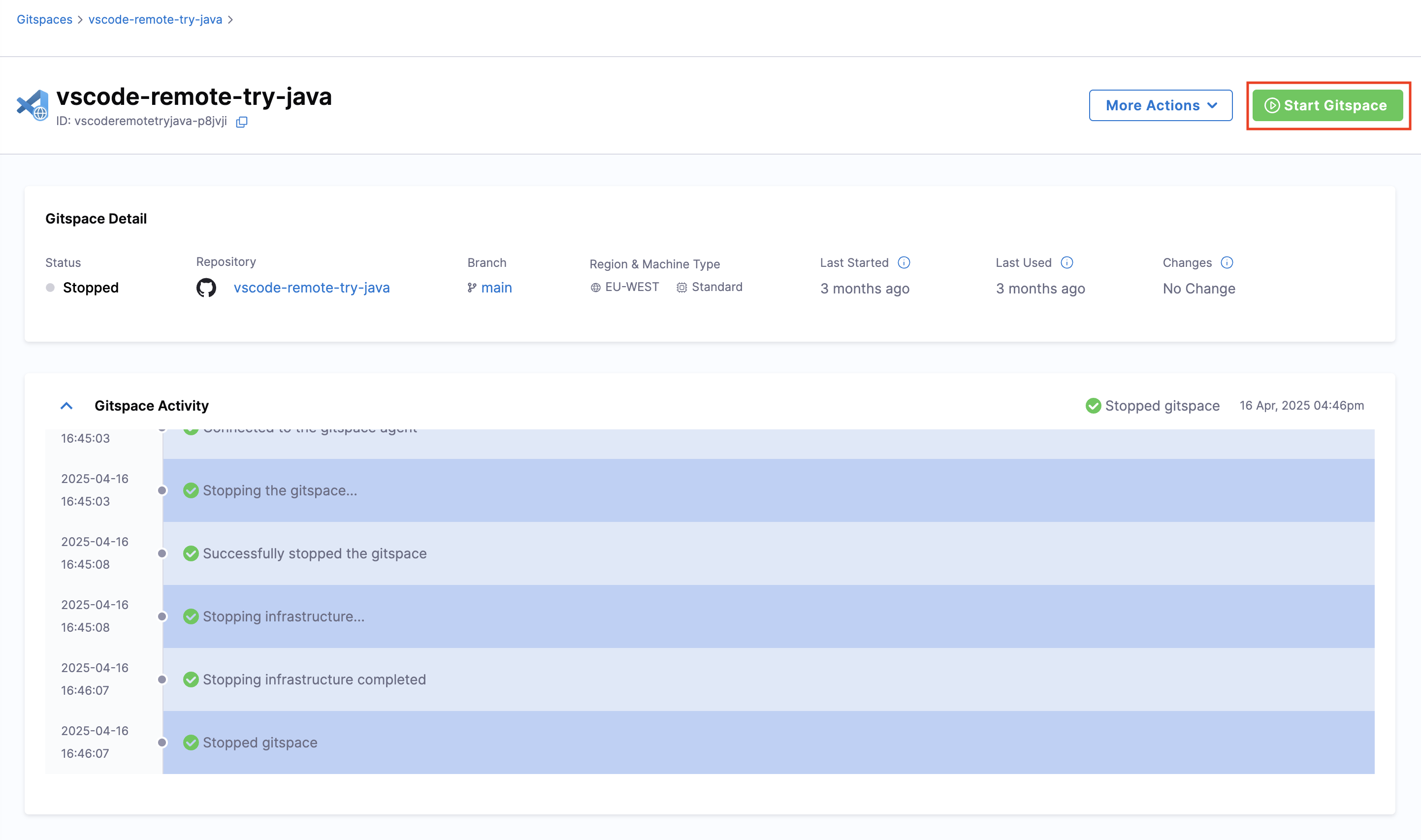 1. On the Gitspace Details UI, Start Gitspace is available in the More Options menu.
