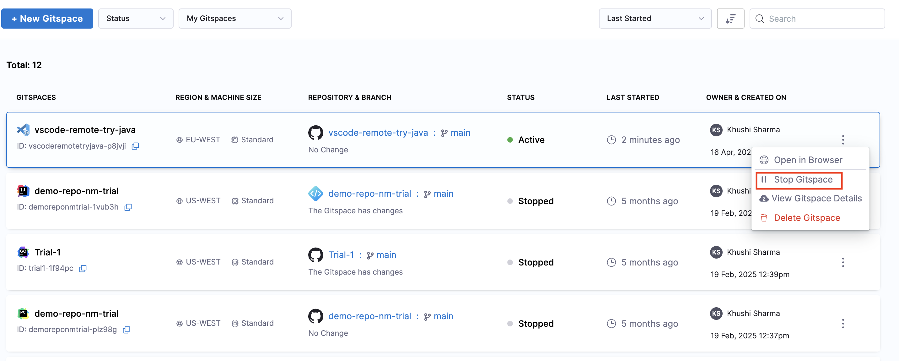 1. On the Gitspaces Dashboard, for any active Gitspace, click on the 3 dots menu and select Stop Gitspace.