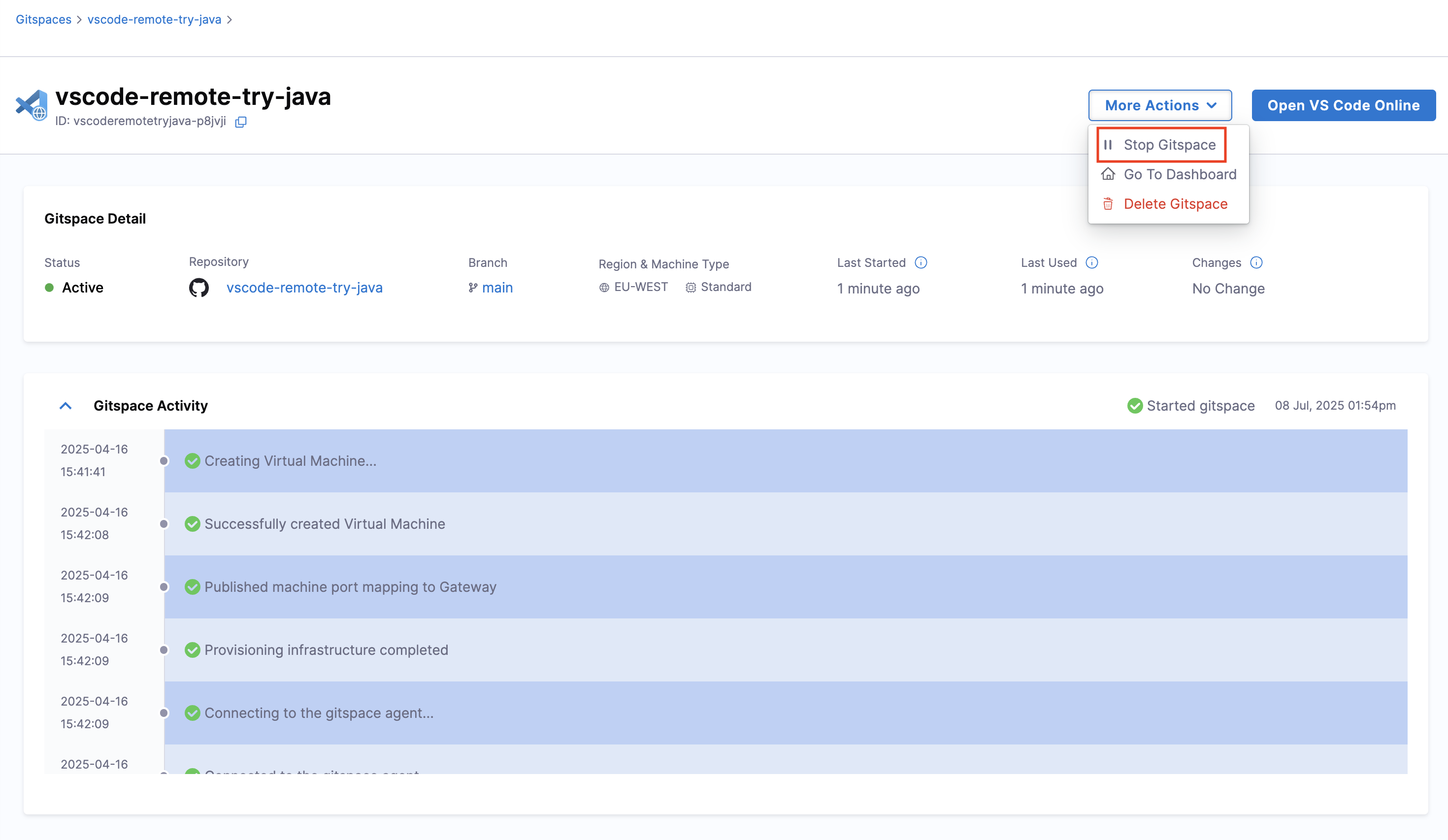 1. On the Gitspace Details UI under More Actions, there's an option to Stop Gitspace.