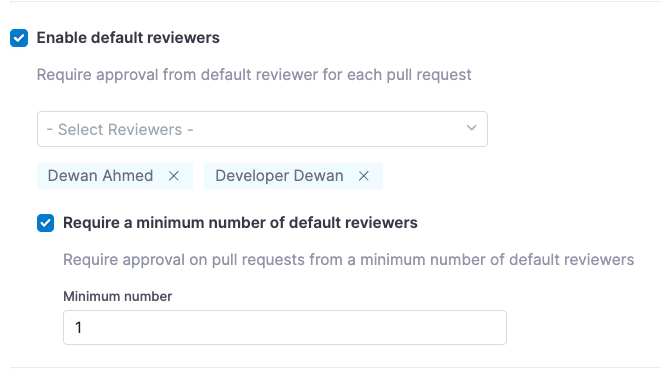 Enable default reviewers | Automatically assigns default reviewers to new pull requests. Optionally, enforce a minimum number of approvals from default reviewers before merging. Details. |