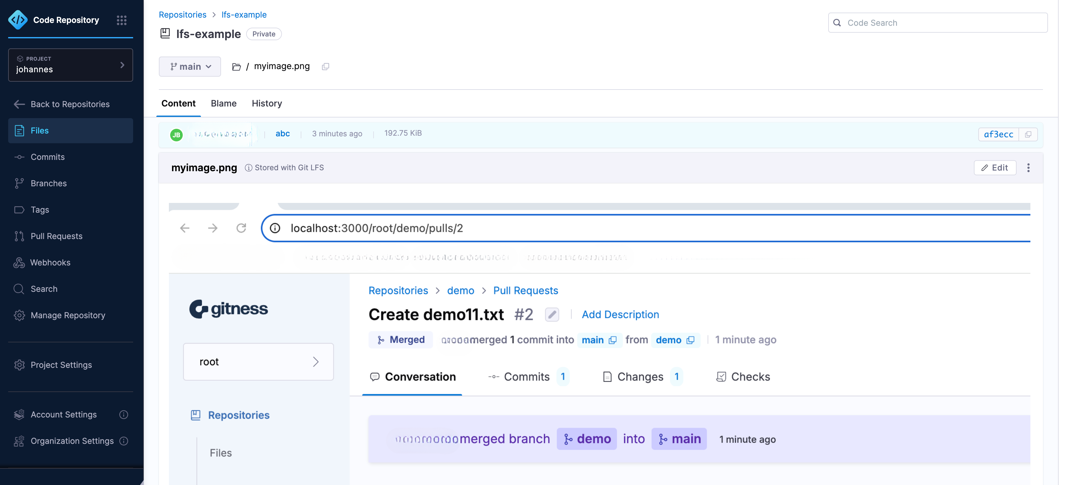 In Harness Code UI, LFS files are rendered directly in the file view page (not in the file listing page) if they are of a supported type (e.g., images) and are less than or equal to 10MB in size. Files tracked by Git LFS are marked as Stored with Git LFS.