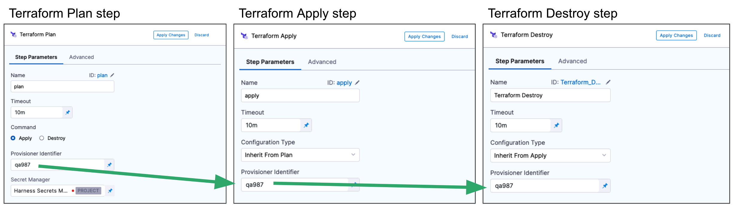 When you destroy the provisioned infrastructure, you specify the same Provisioner Identifier in the Terraform Destroy step. The Provisioner Identifier enables Harness to locate the same Terraform script used for provisioning.