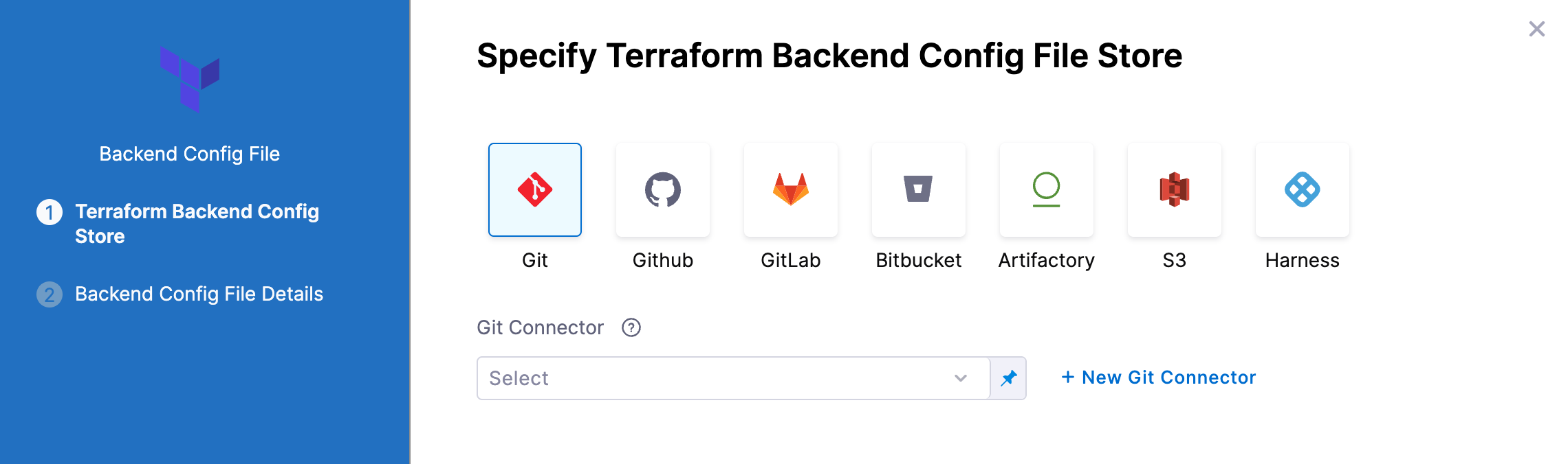 Select or create a Connector for your repo. For steps, see Connect to a Git Repo or Artifactory Connector Settings Reference (see Artifactory with Terraform Scripts and Variable Definitions (.tfvars) Files).