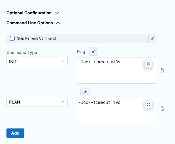 This setting allows you to set the Terraform CLI options for Terraform commands depending on the Terraform step type. For example: -lock=false