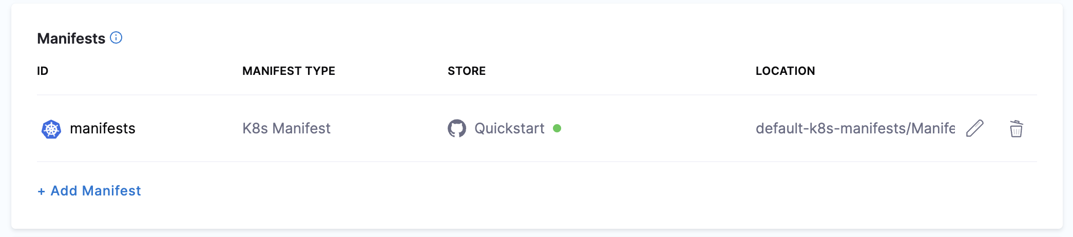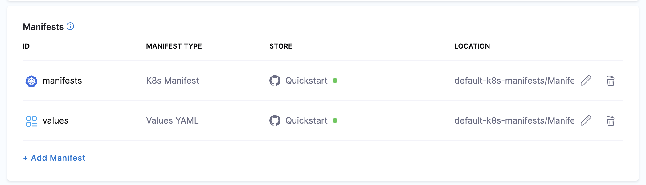 Manifests: You can use manifests stored in a Git repo or Harness.