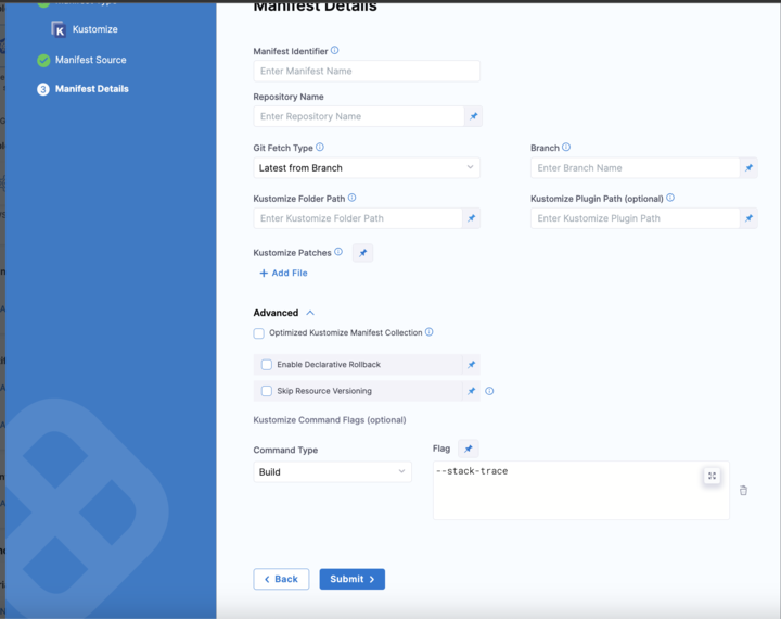 Click Submit. Harness is now configured to use the plugin when it deploys using Kustomize.