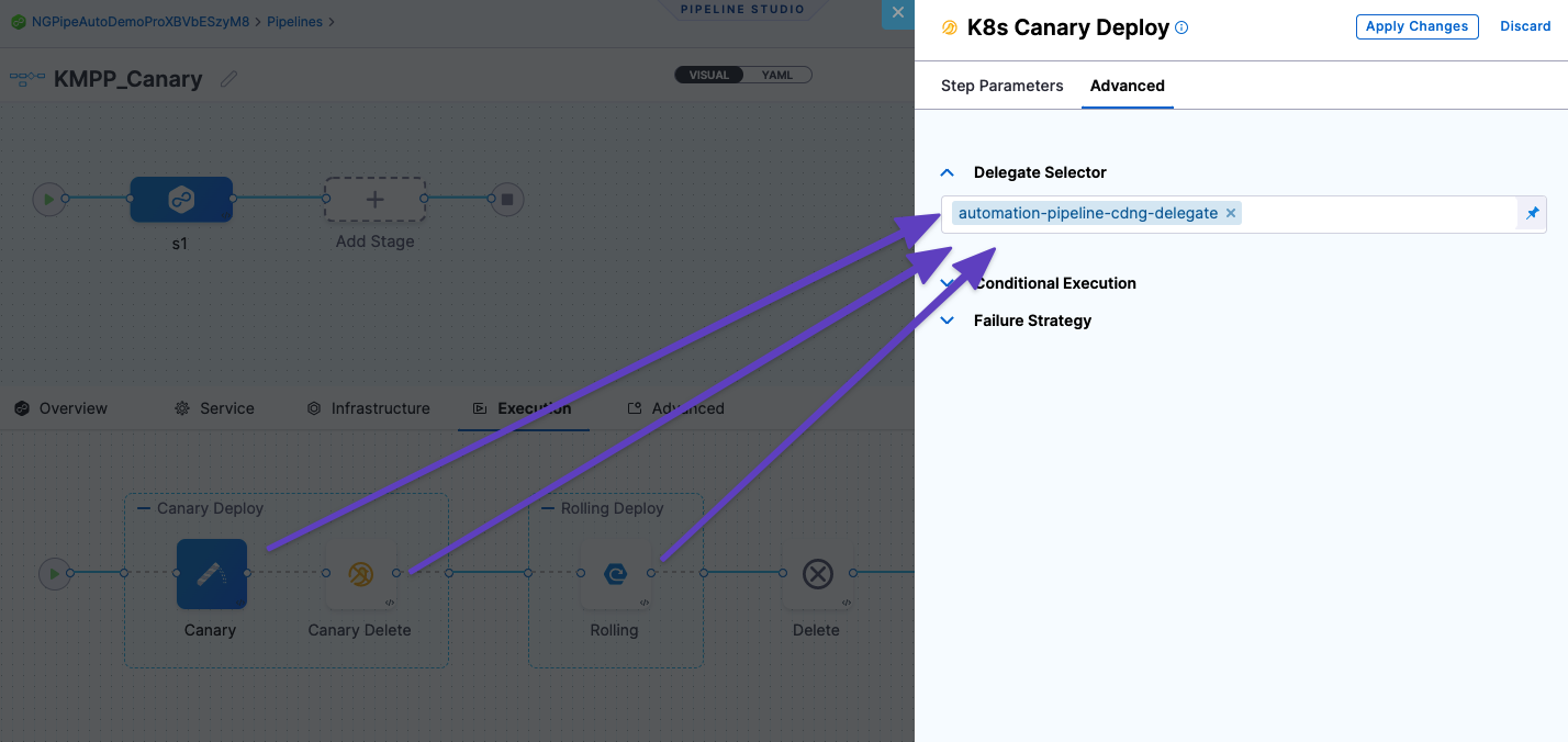 For example, if your stage Execution has Canary, Canary Delete, and Rolling steps, open each step, select Advanced, and then select the Delegate Selector for the Delegate that has the plugin installed.
