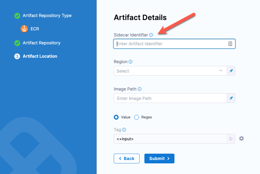 You reference sidecar artifacts with the format <+artifacts.sidecars.[artifact_Id]>
