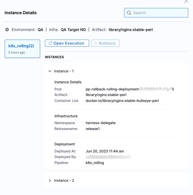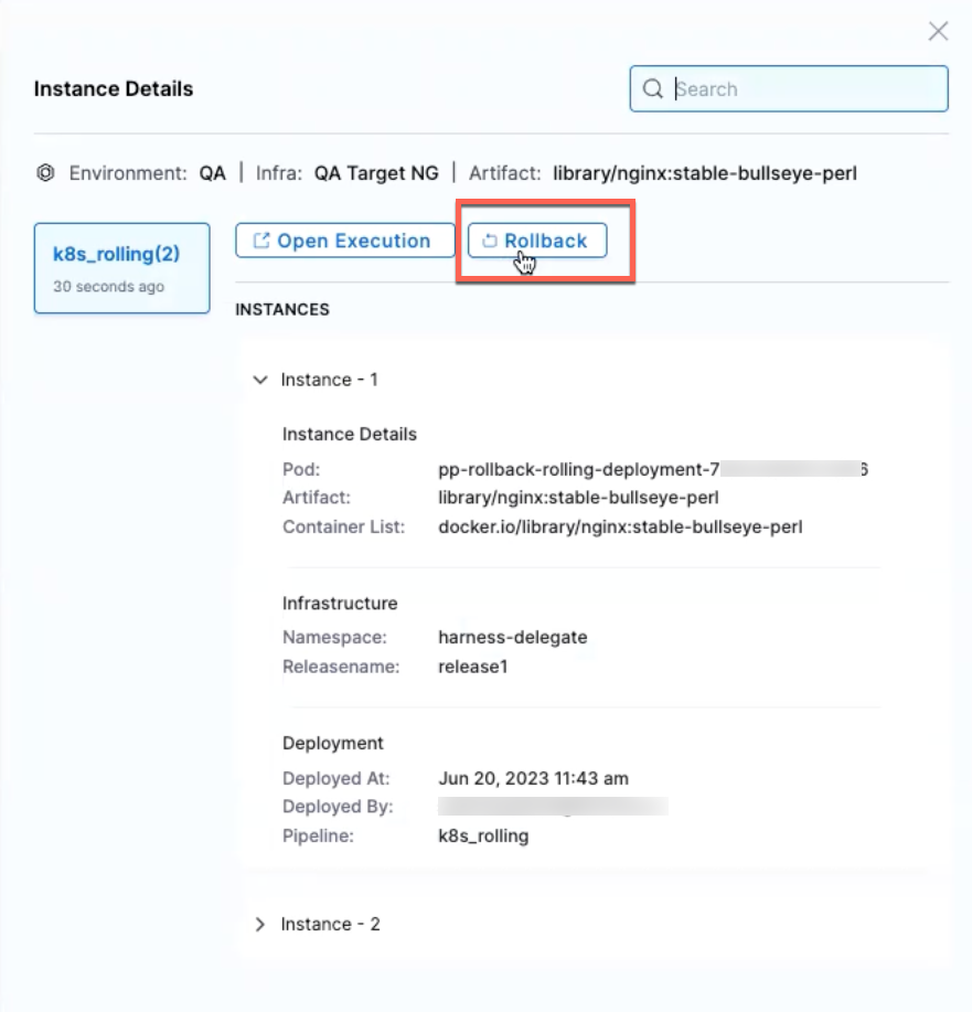 Click on View Instance and Rollback. All executions will be displayed along with their environment details. You can only perform a rollback in the Environment view.