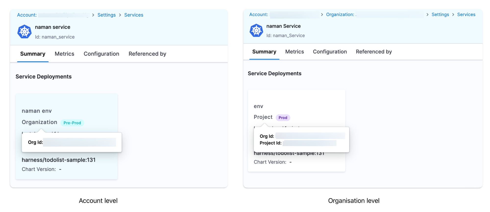 To distinguish between environments, hover over the Organisation/Project in the card to view the org_id and project_id of the service deployment. You can view the deployments in the Environment, Artifacts, or Charts view.