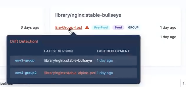 Drift detection: drift detection displays any differences between the deployments to environments in an environment group. For example, if the artifact you select was deployed to an environment group, but one of the group's environments deployed a different artifact, or due to some failure no artifacts were deployed to it, it is highlighted as drift: