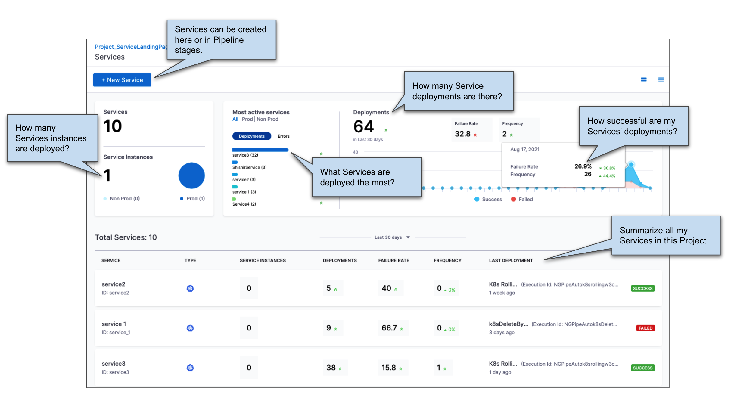 Deployments and services can be measured within the CD module (Overview and Services in the Deployments module), and using the Harness Platform Dashboards (Dashboards). Platform Dashboards also let you create highly advanced custom dashboards.