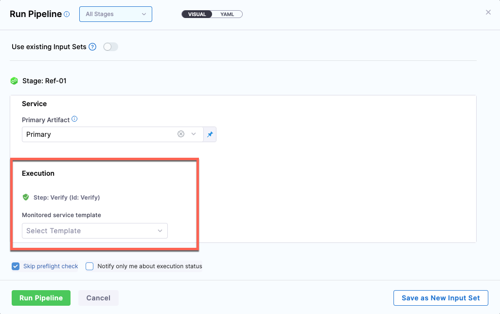 During run time, in the Run Pipeline page's Execution > Step: Verify > Monitored service template section, select Select Template.