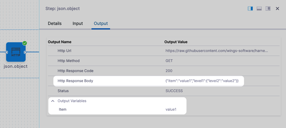 When this HTTP step is executed, in its Output tab, you can see the HTTP response in HTTP Response Body and the object in the Output Variables: