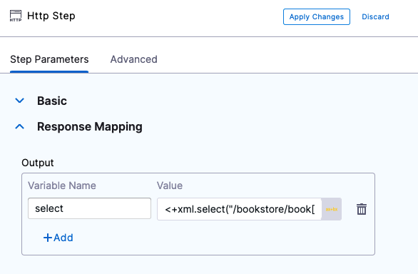 When this HTTP step is executed, in its Output tab, you can see the HTTP response in HTTP Response Body and the selection in the Output Variables: