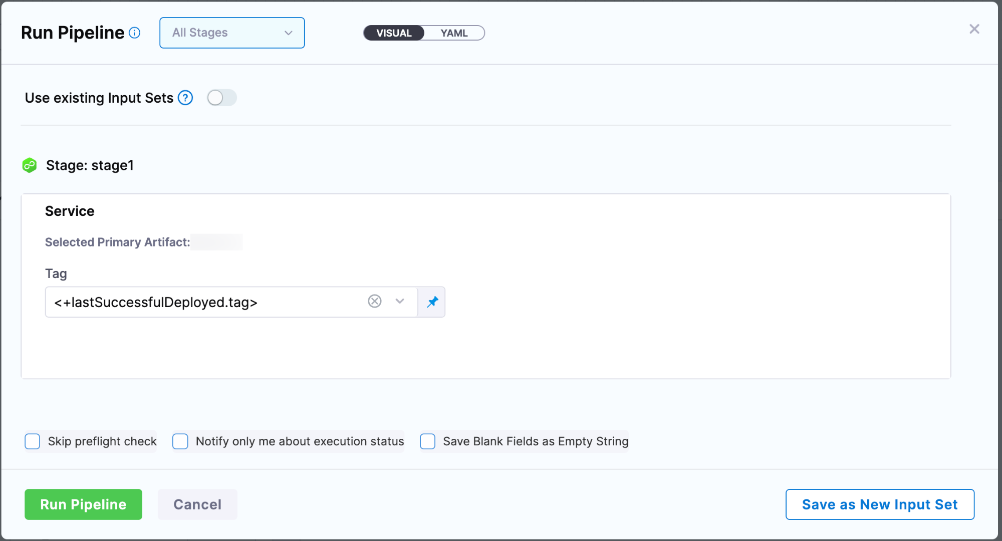 If the Disable artifact in this stage checkbox is enabled, and the artifact or artifact tag is configured as runtime inputs, the pipeline will not prompt for the artifact or artifact tag during execution.