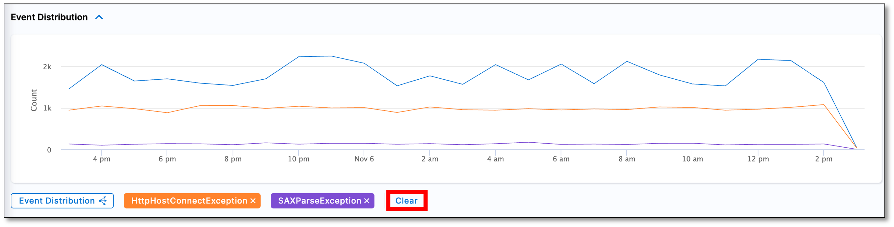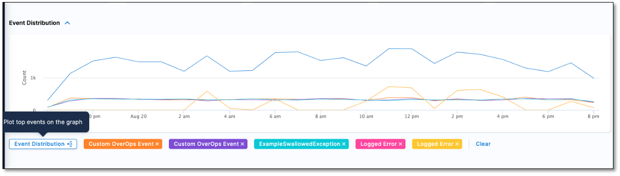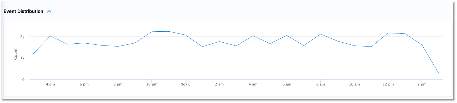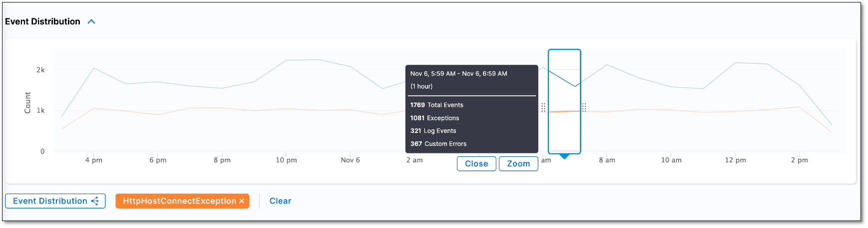The Event Distribution Graph provides an interactive visual representation of event volume within the selected timeframe and view. It helps you analyze historical performance metrics and track error counts within your specified time interval.