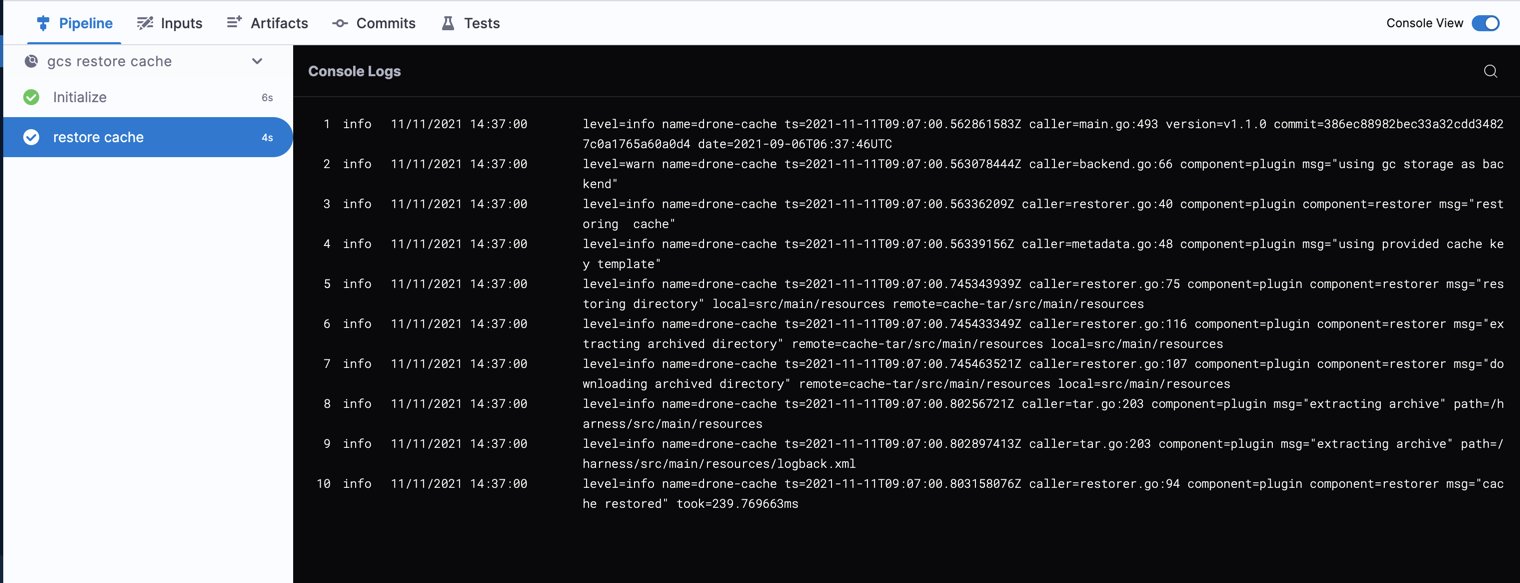 level=info name=drone-cache ts=2021-11-11T09:07:00.803158076Z caller=restorer.go:94 component=plugin component=restorer msg="cache restored" took=239.769663ms