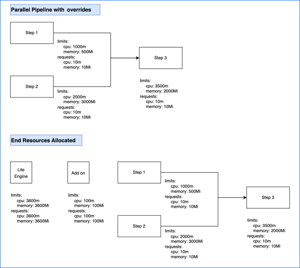 - The two parallel steps must run at the same time; therefore, the stage needs up to 3000m CPU and 3500Mi memory to run those two steps.