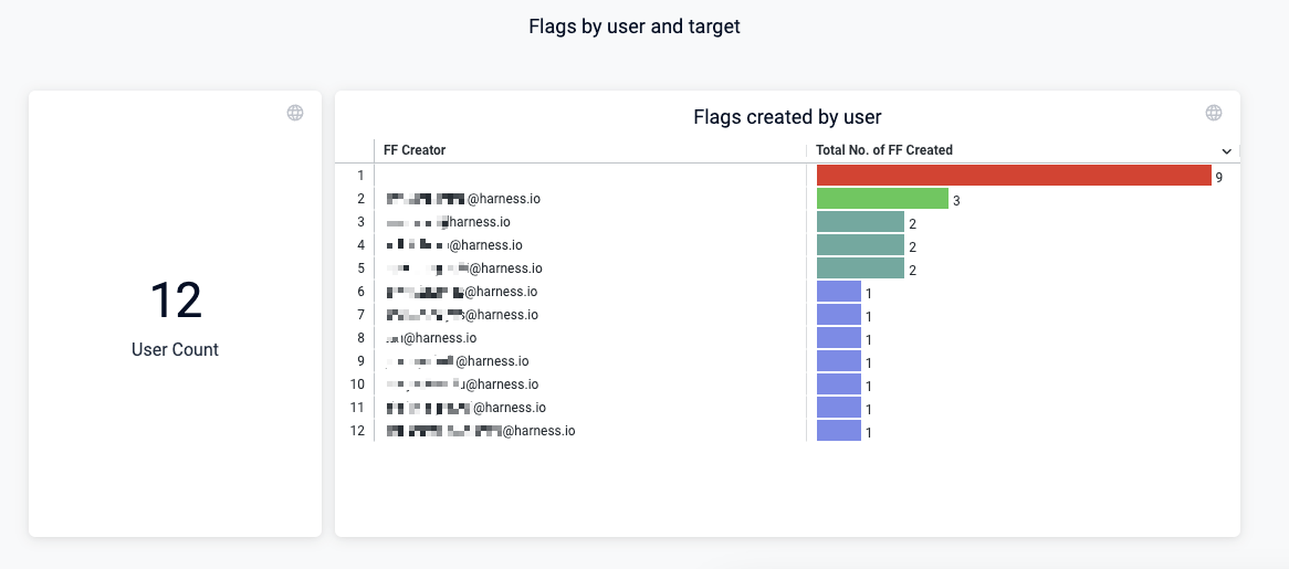 This chart is helpful to see who in your organization is creating flags, and how many. One way to use this is to help adoption of feature flag usage by having the people who create a lot of flags help others to use them.