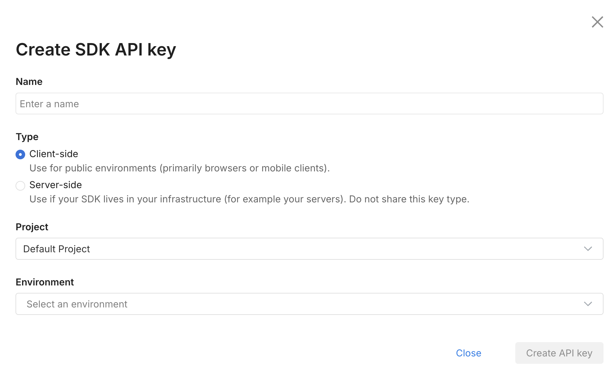 Select Server-side. Give it a name and optionally restrict it to environments and projects that you are using the API key for.