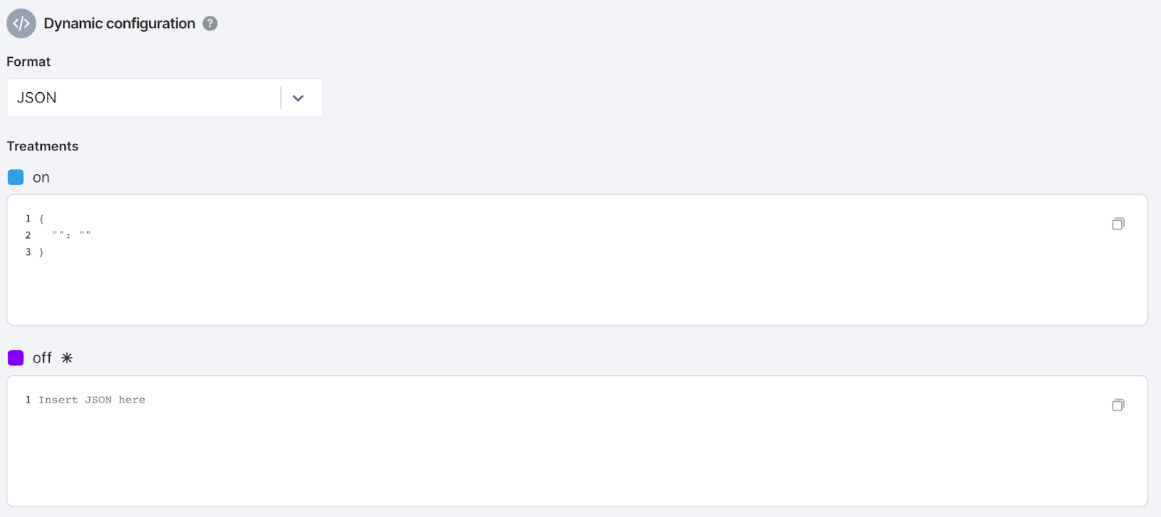 2. In the Format field of the Dynamic configuration area, select JSON as your format. You get a JSON editor for each of your treatments.