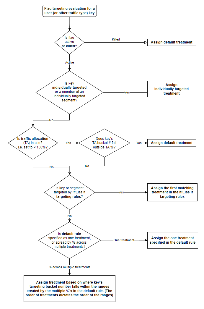 • The feature flag is killed. If a particular feature flag is killed, the default treatment overrides the existing targeting rules and is returned for all customers.
