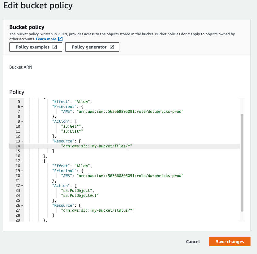- Under Edit bucket policy, select Bucket policy and replace the JSON with the following snippet. Update the Role ARN with the value generated by Harness FME as well as your bucket name as appropriate.